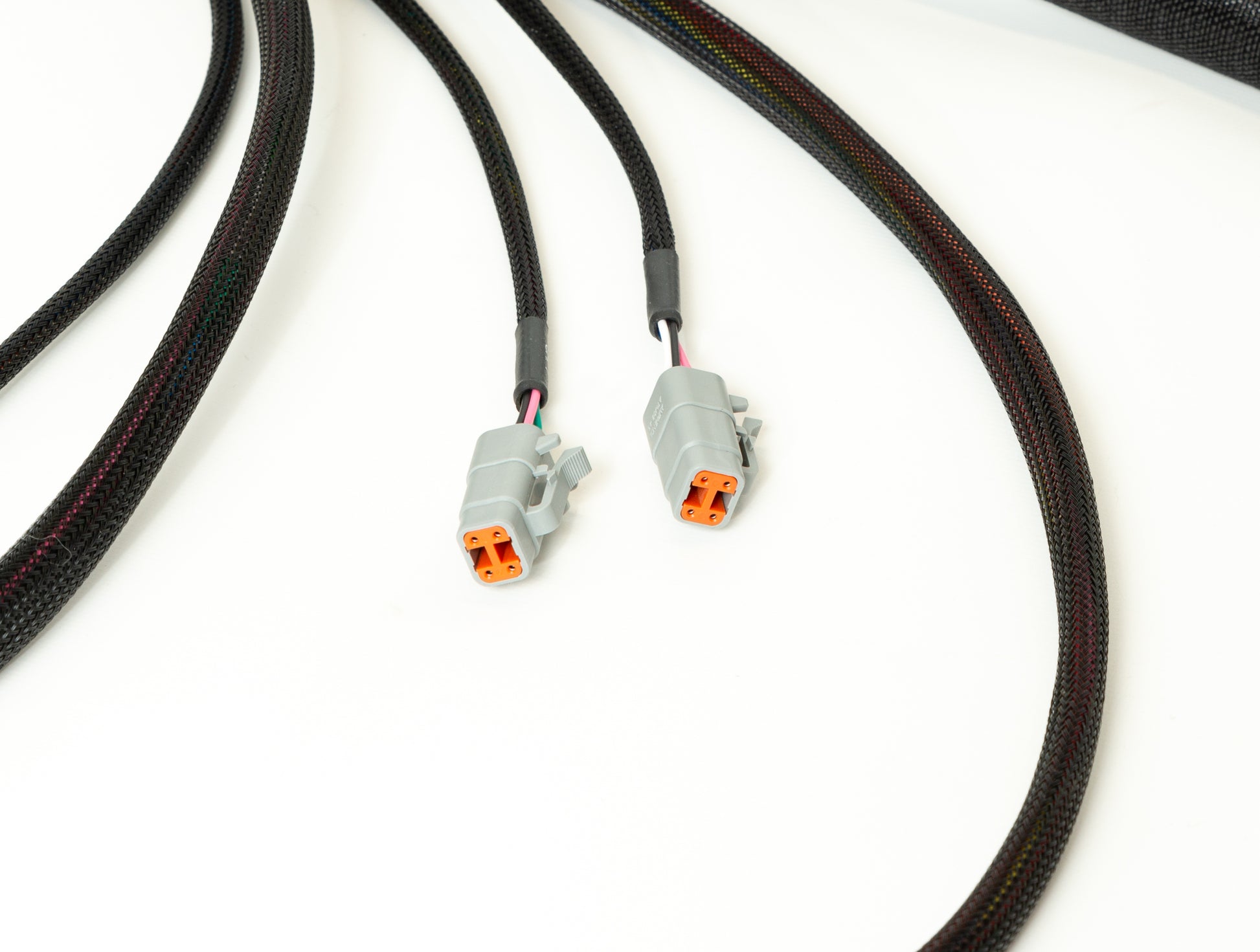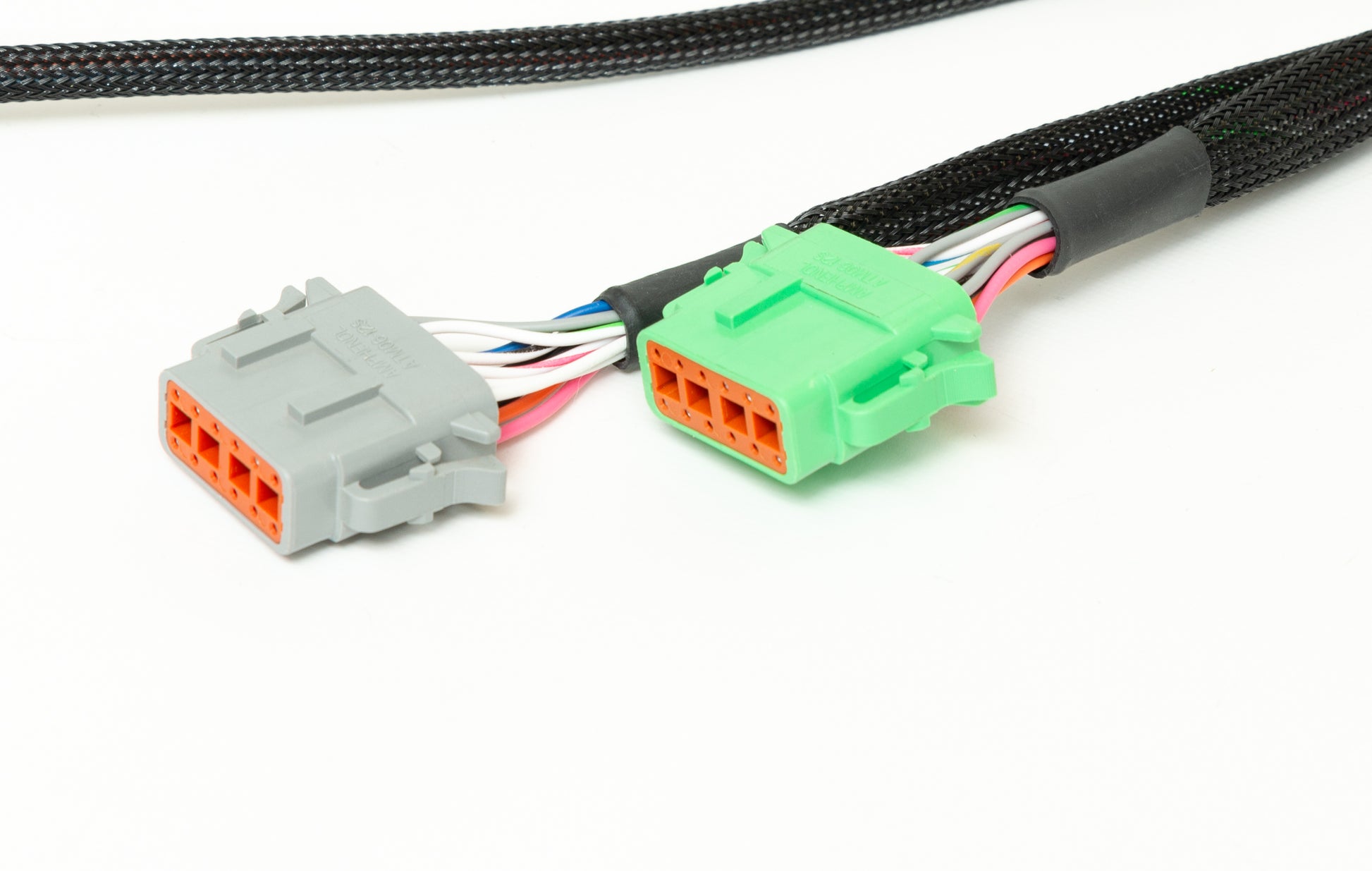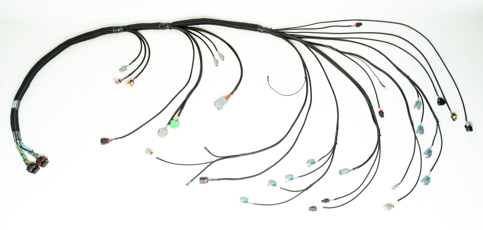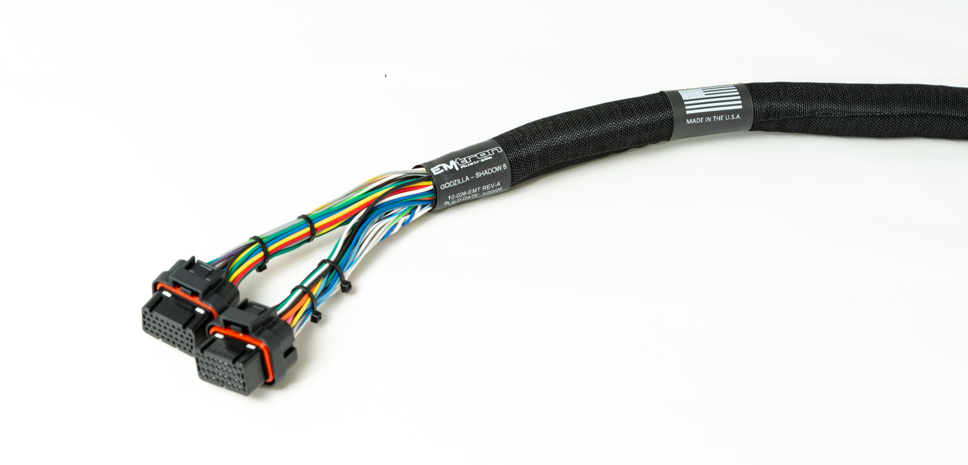 Introducing the Ford Godzilla to Shadow 8 Terminated Harness. This harness is constructed using TXL wire and is covered with a Non-Split nylon braid and suits the Ford Godzilla Engine with Electronic Throttle. Each harness system includes Deutsch loose terminal connector kits for both I/O stubs, Power Distribution stub and front accessory stub. It includes a pair of Ignition coil sub-harnesses to suit the 2023+ Godzilla Coil.